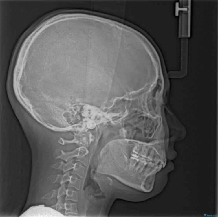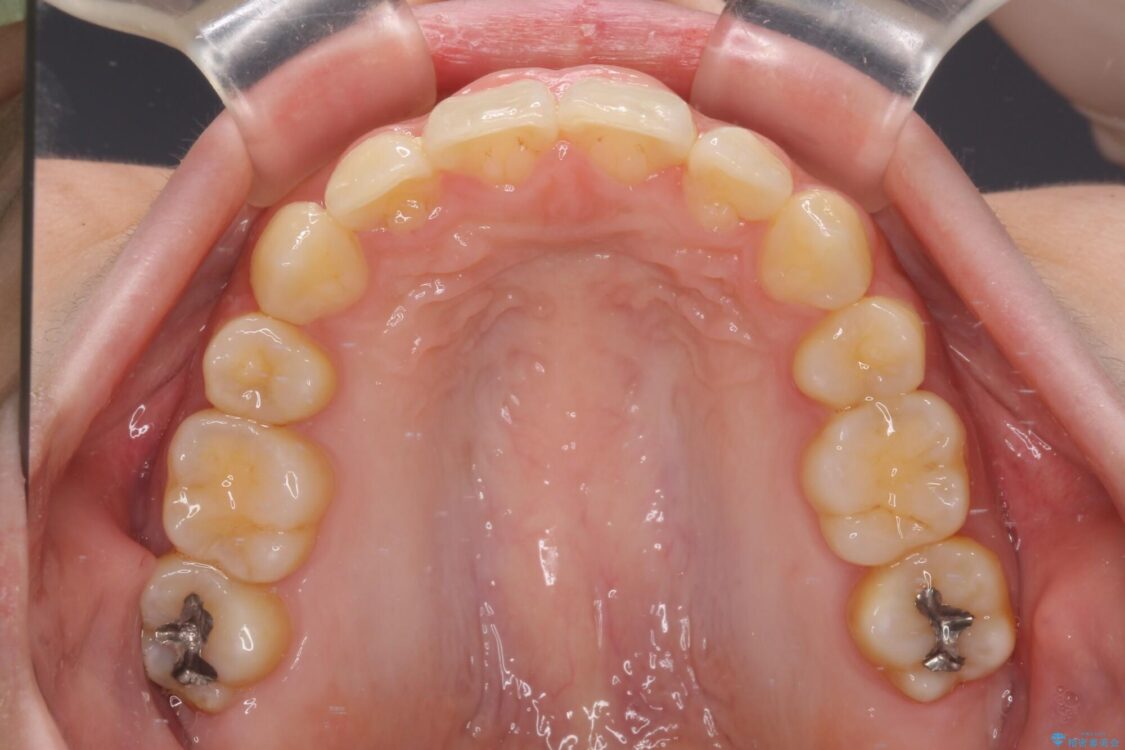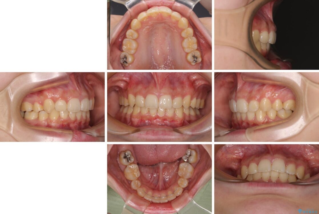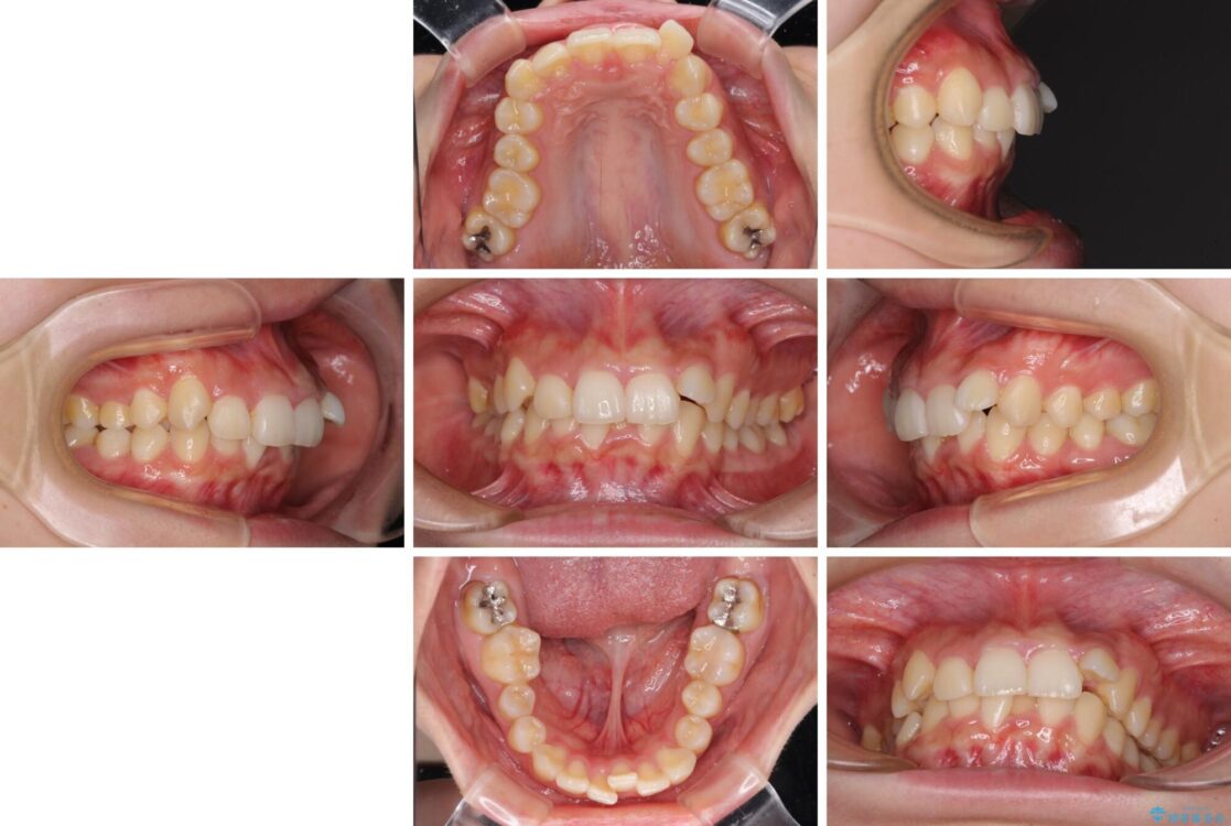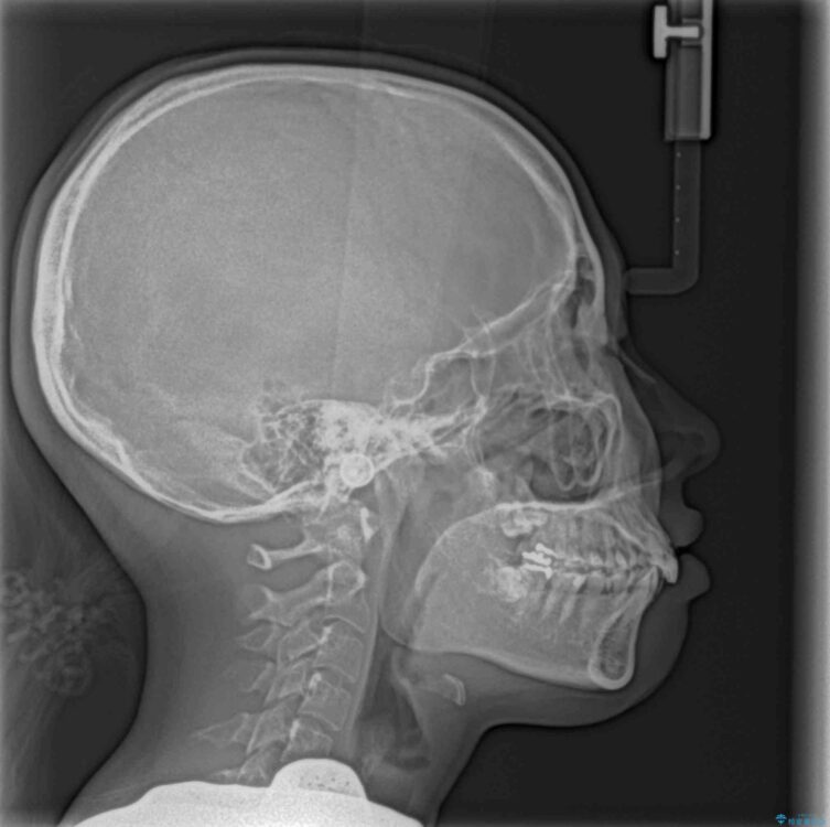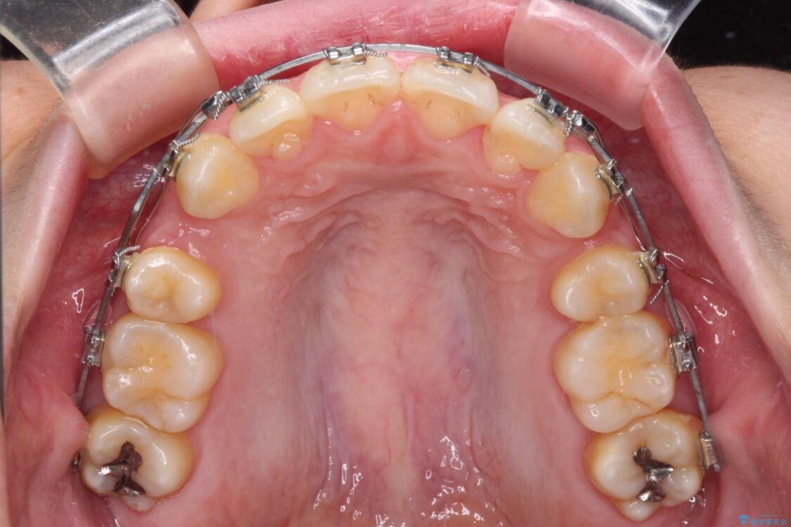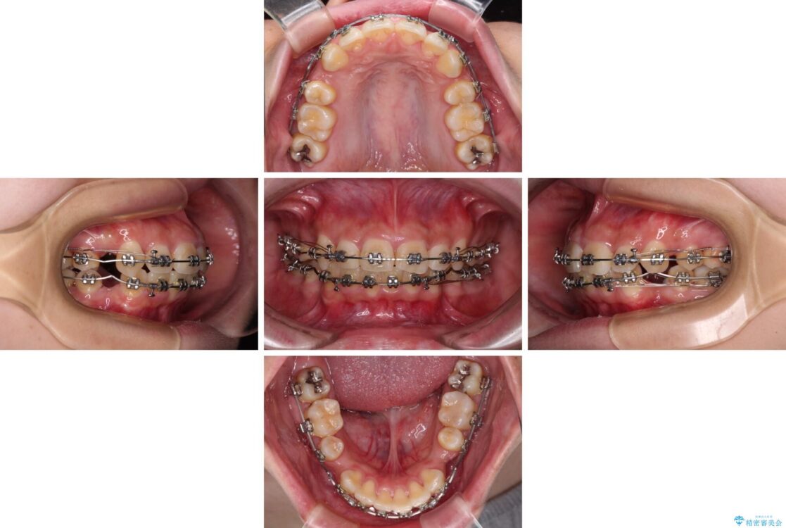 下顎骨の左右差や、上顎骨の前方位などが認められたため、上下左右の第1小臼歯4本を抜歯し、ワイヤー装置にて矯正治療を行うこととしました。