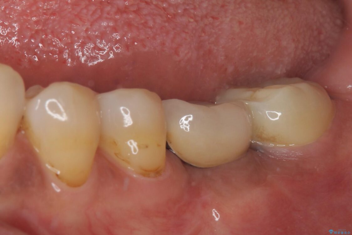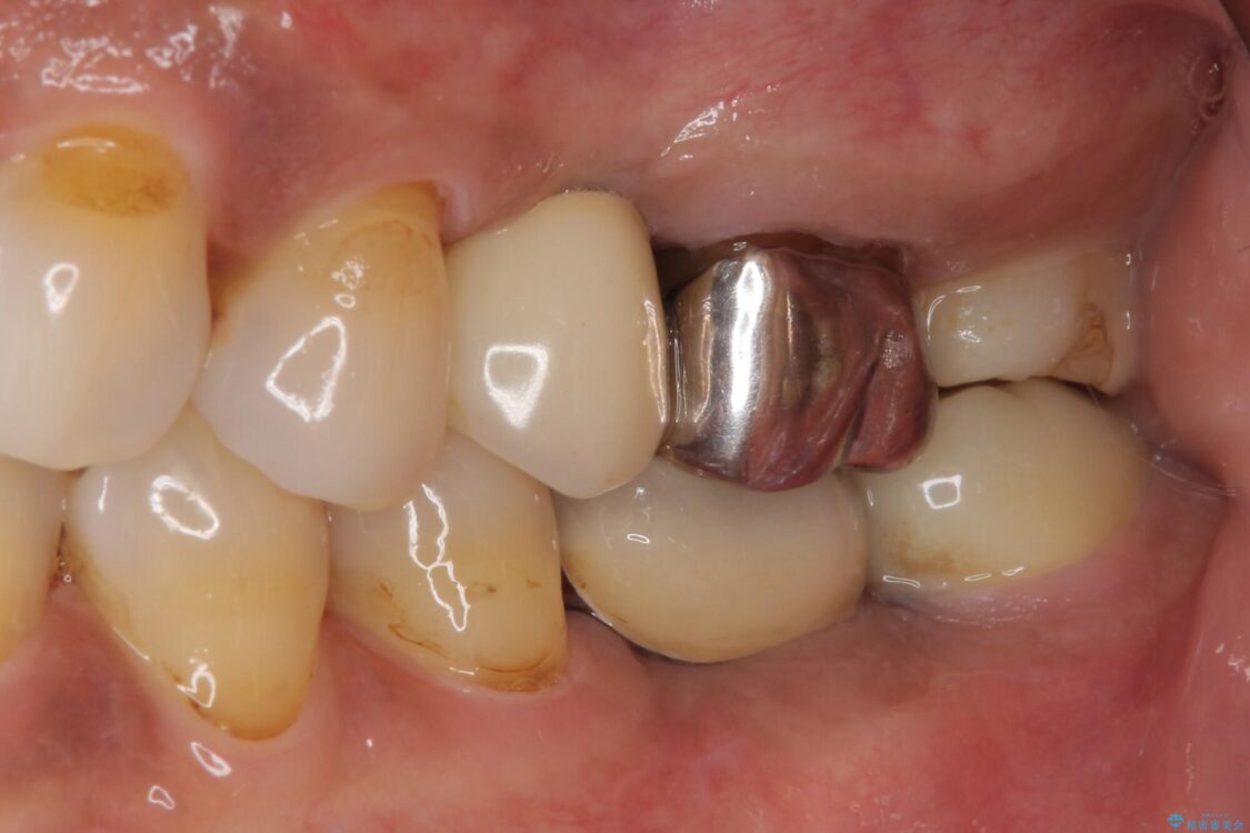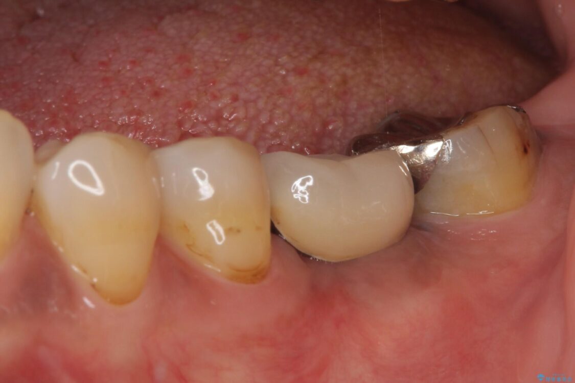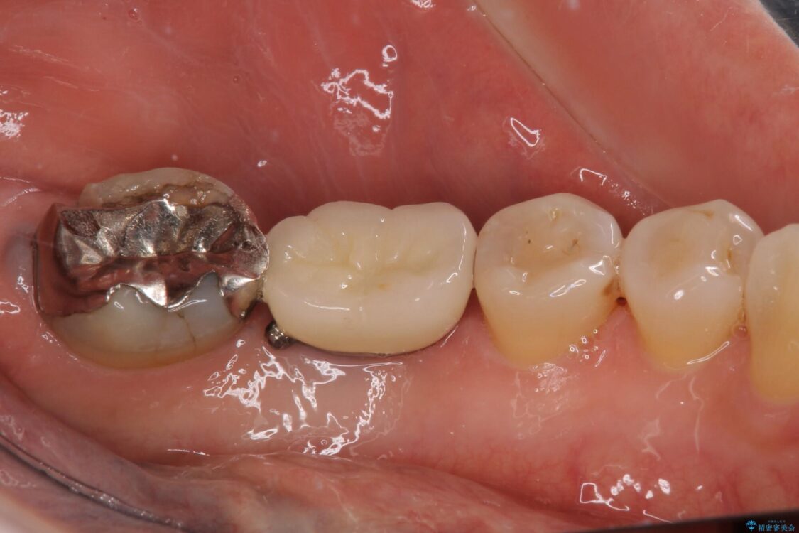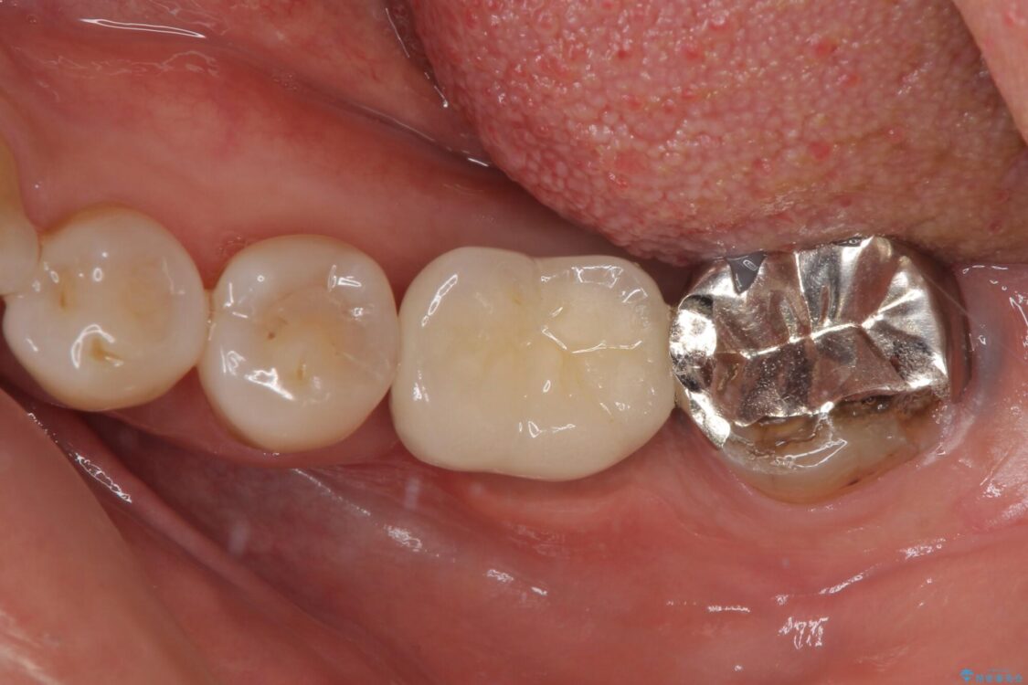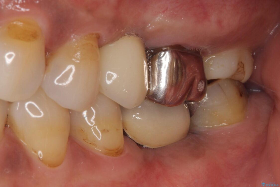 銀歯周辺の歯が欠けており、むし歯も進行している状態であったので、オールセラミッククラウンにて補綴治療を行うこととしました。