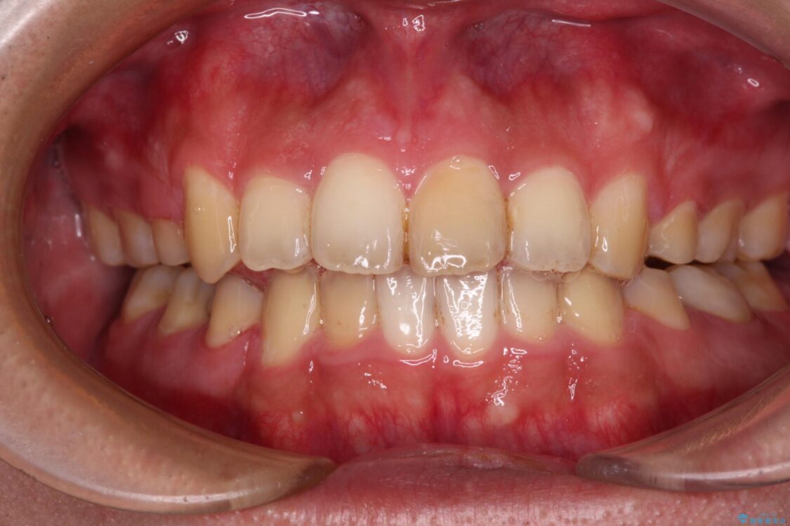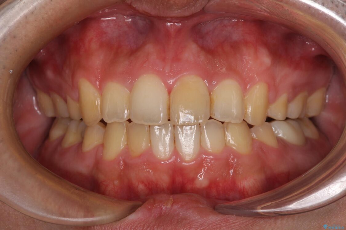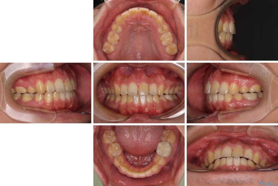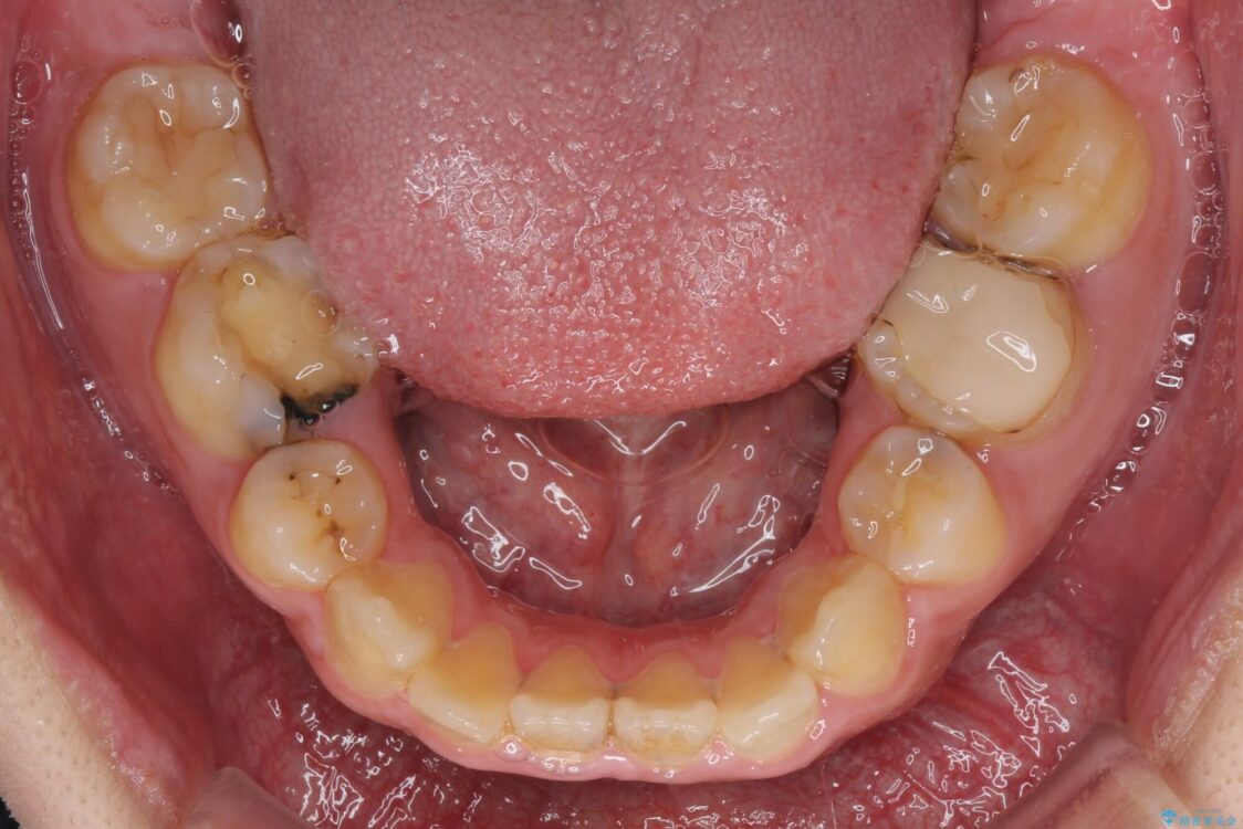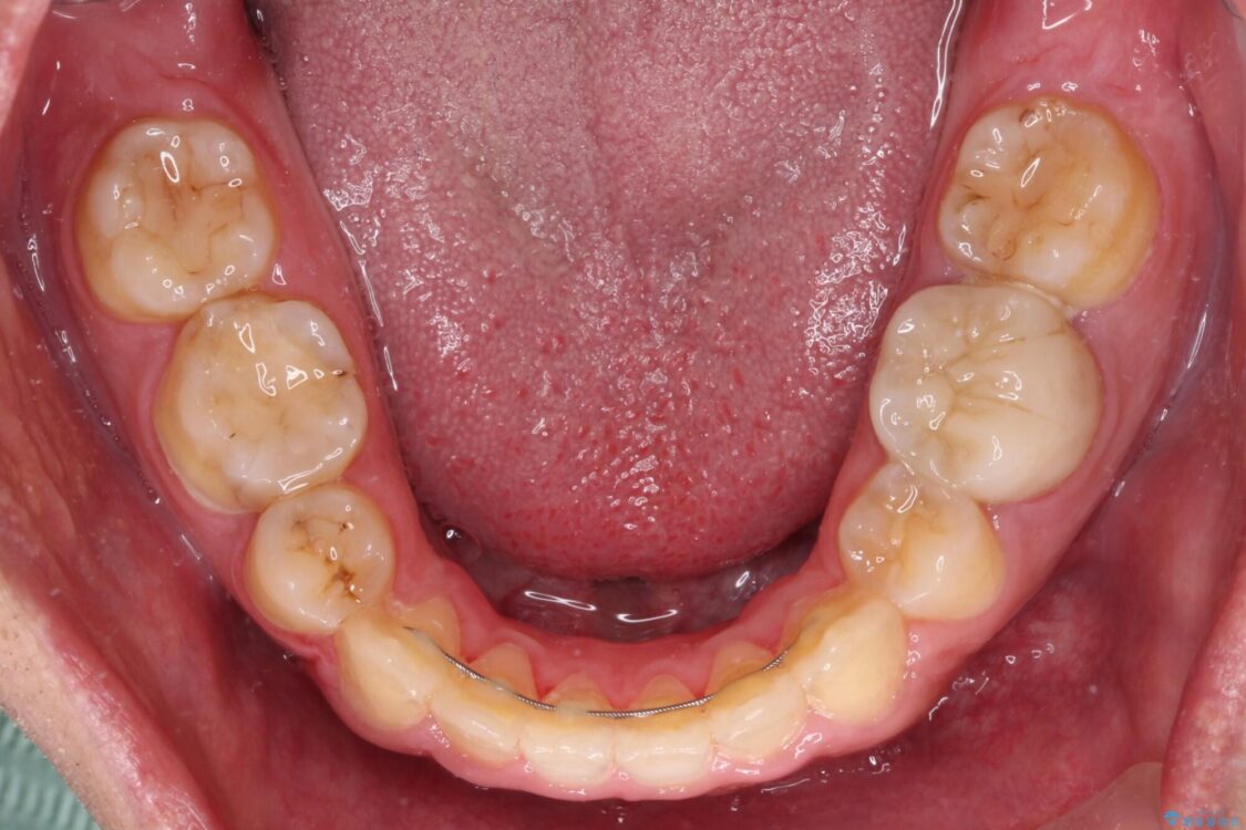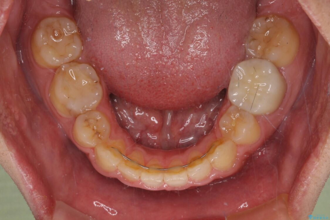 下顎骨が左側に変位しているため、正中が合わないことは予想できましたが、歯列が整った後も咬み合わせが安定せず、咬み合わせを落ち着かせるために1年以上の期間を要しました。
