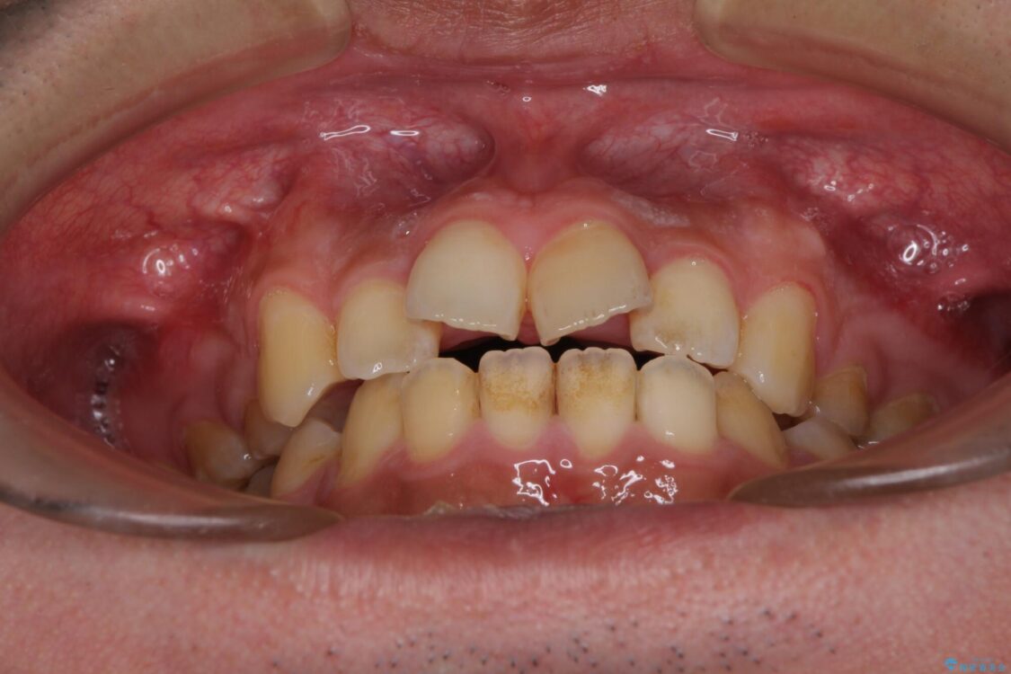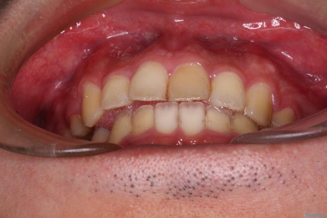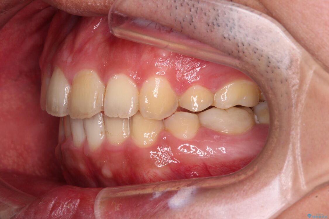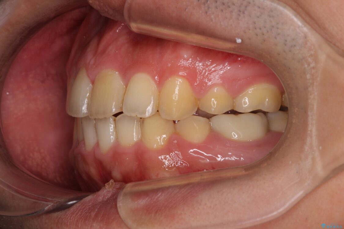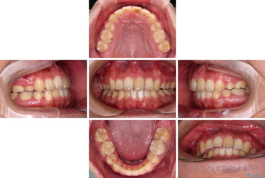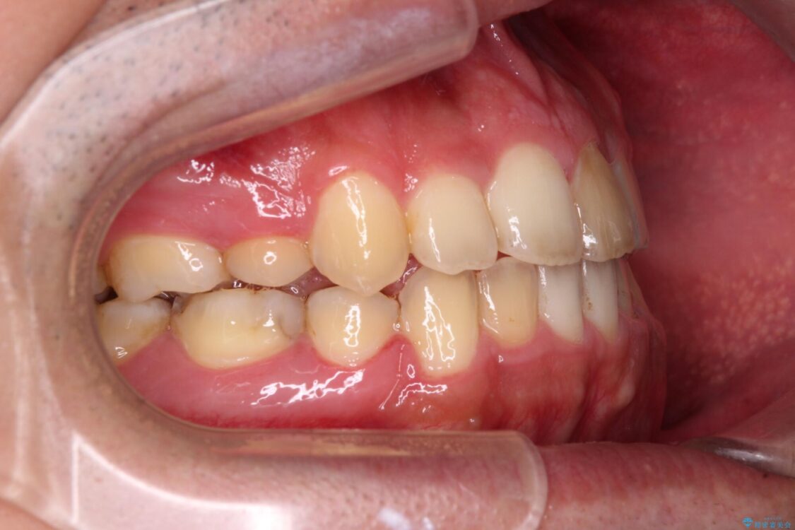 下顎骨が左側に変位しているため、正中が合わないことは予想できましたが、歯列が整った後も咬み合わせが安定せず、咬み合わせを落ち着かせるために1年以上の期間を要しました。