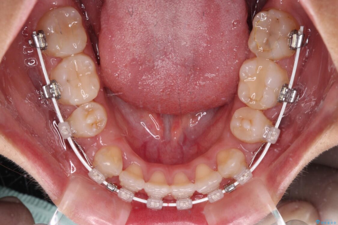 裏側装置での矯正治療は、上顎前歯の正中のズレをまっすぐに改善することが難しいのですが、きれいに整えることができました。