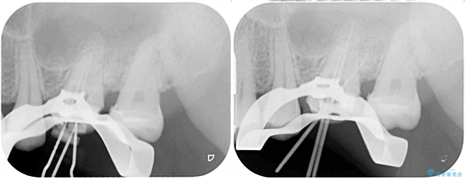 初診時は神経組織の生活反応が認められましたが、2日後に処置を行ったときには、既に反応はなくなっている状態でした。