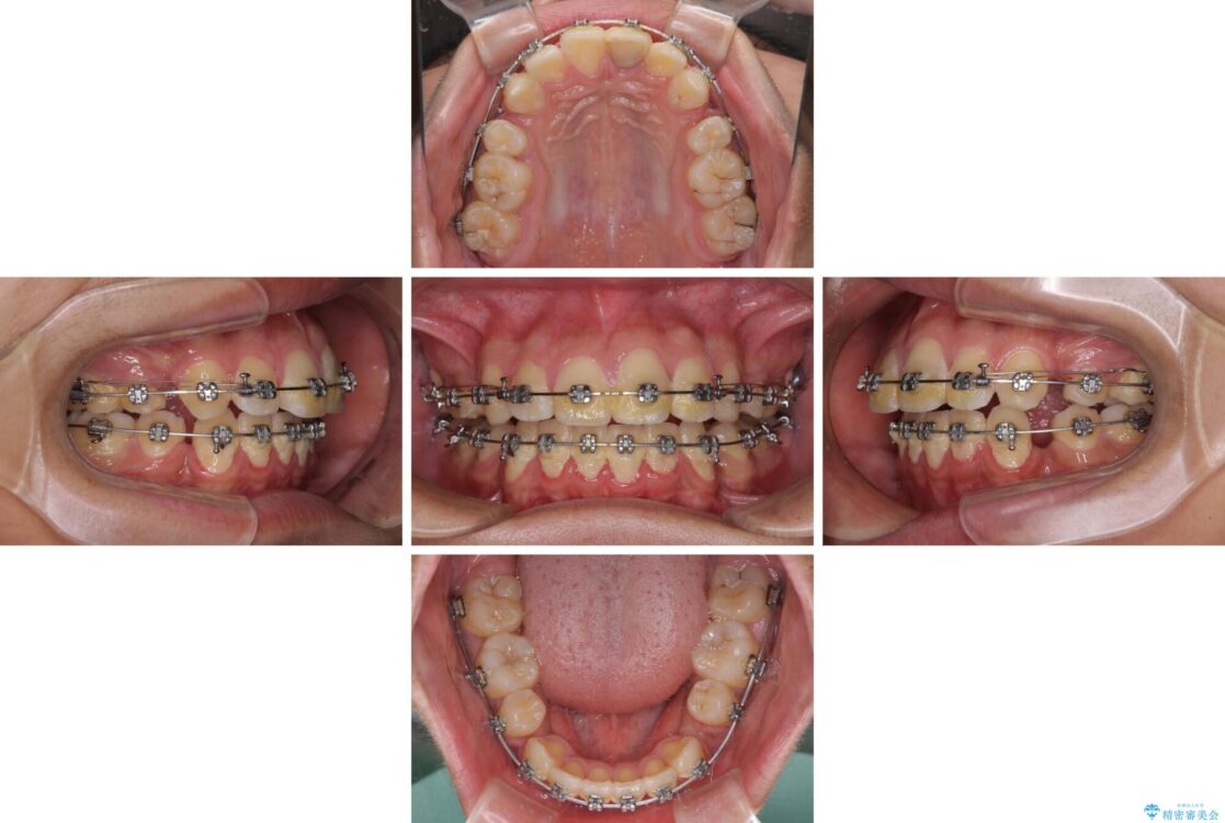 上下前歯が著しく前突している状態であったので、上下左右の第1小臼歯4本を抜歯し、ワイヤー装置にて矯正治療を行うこととしました。