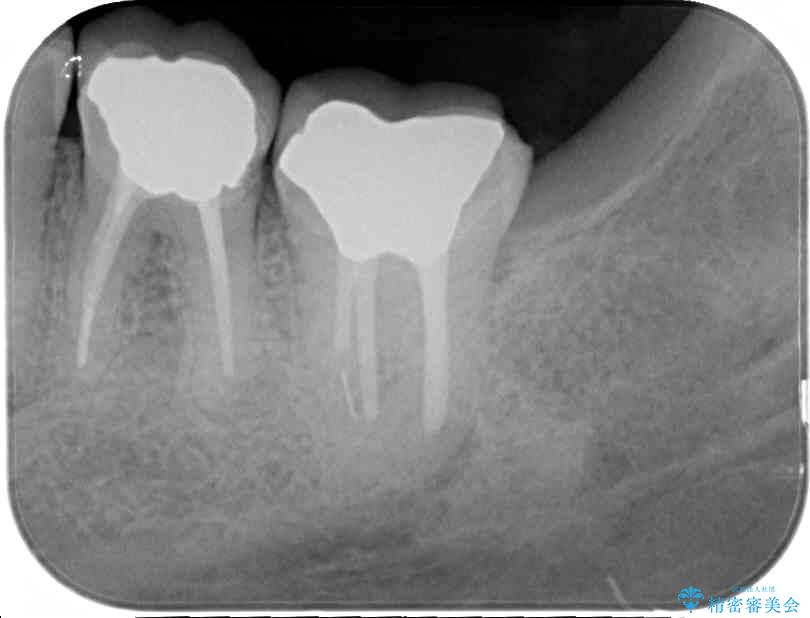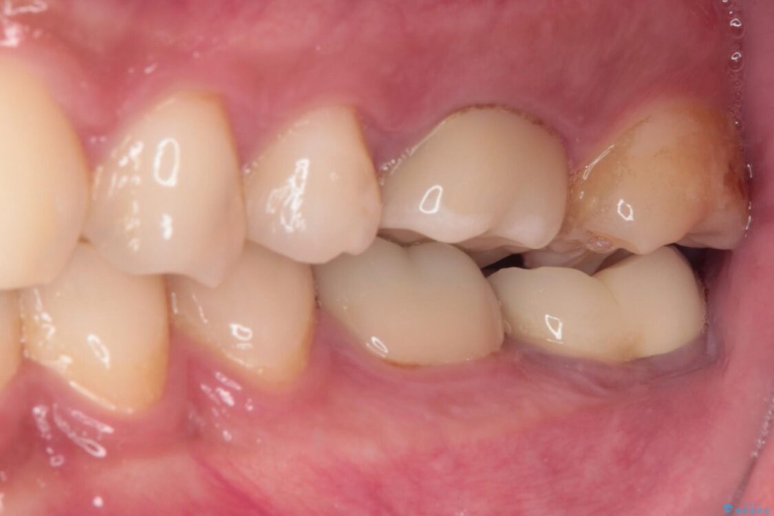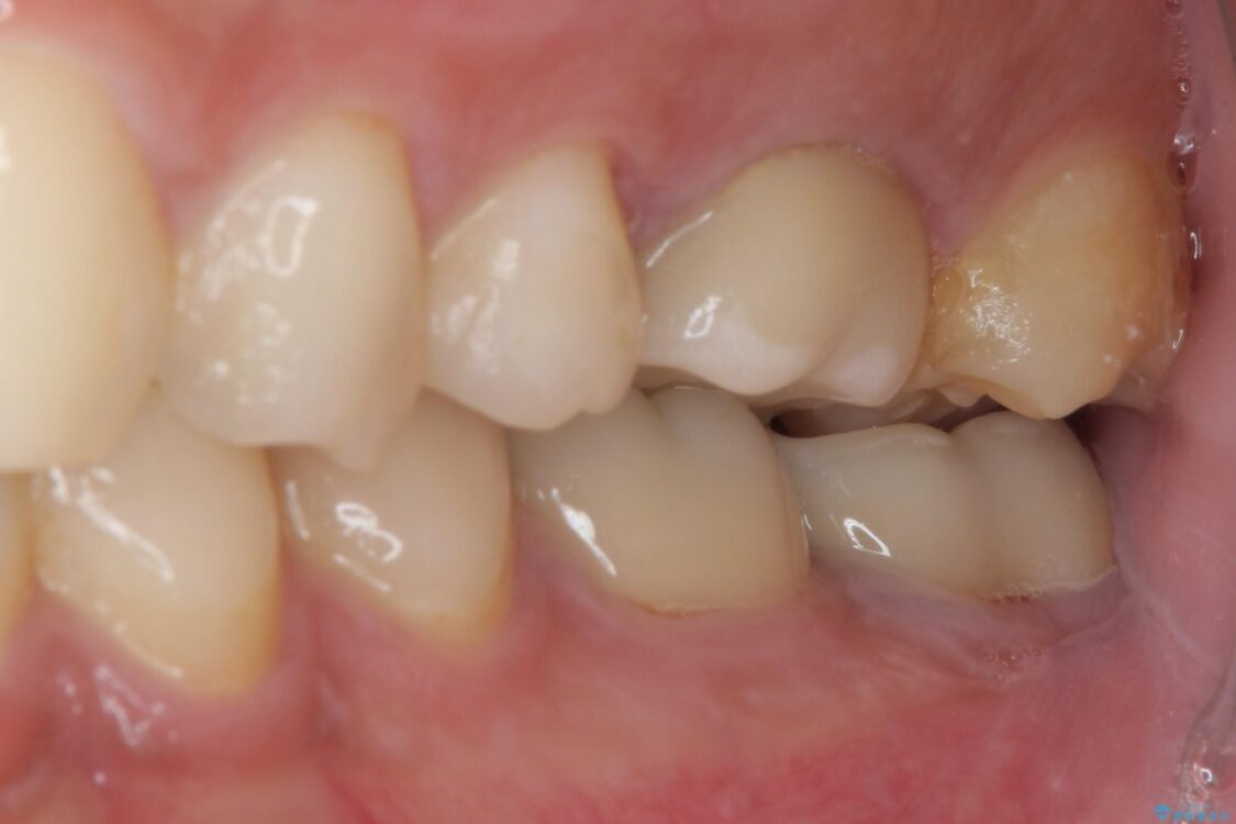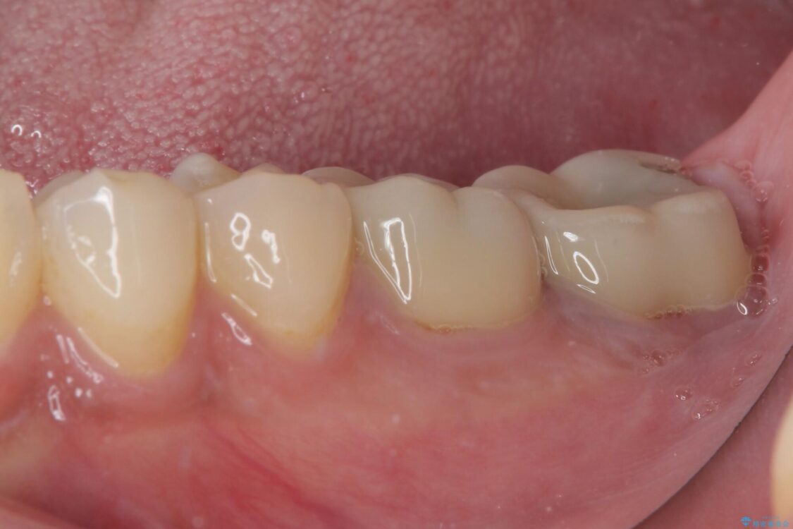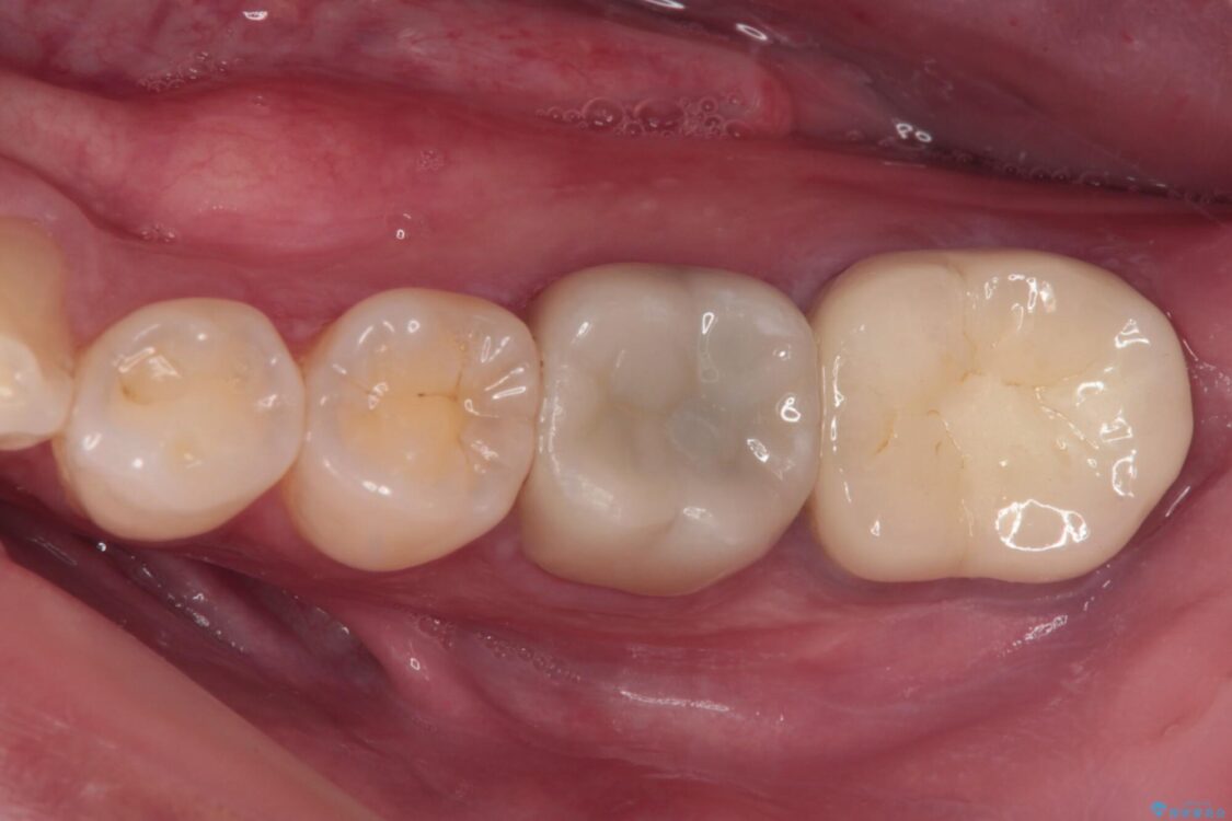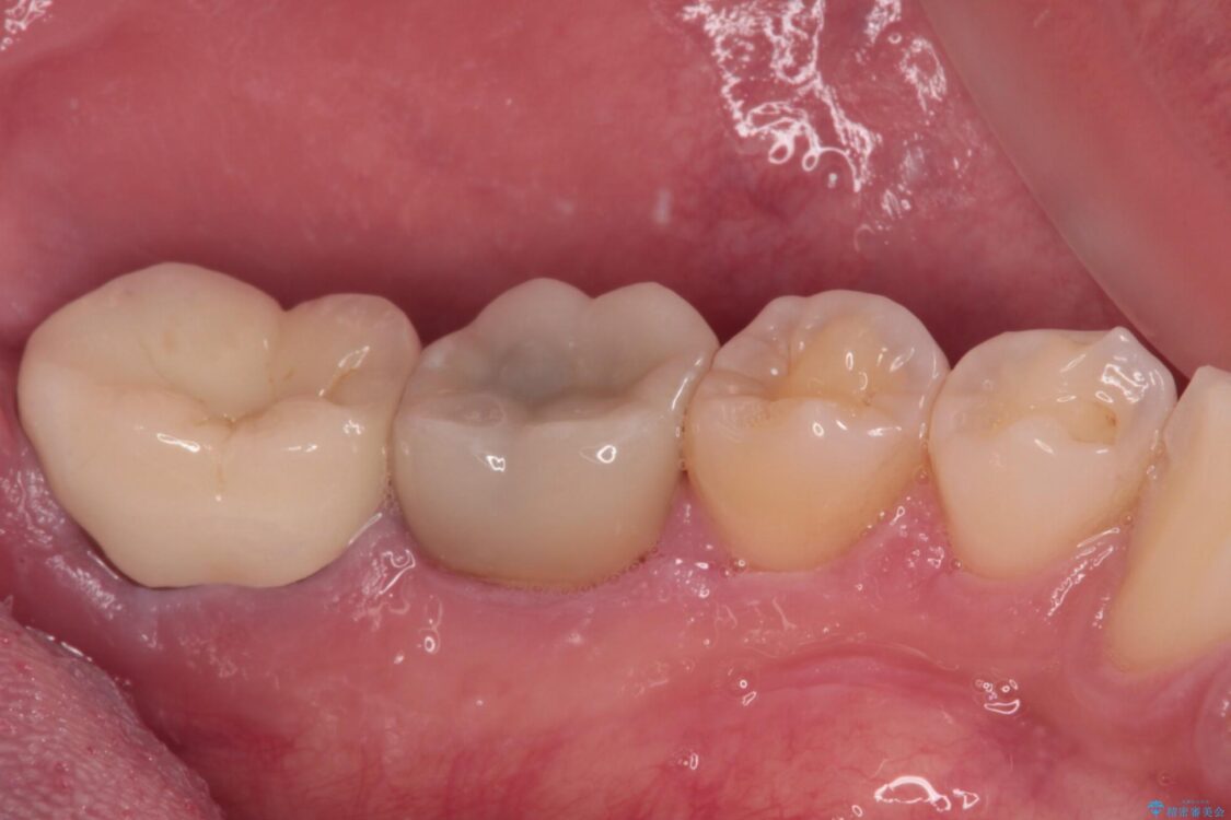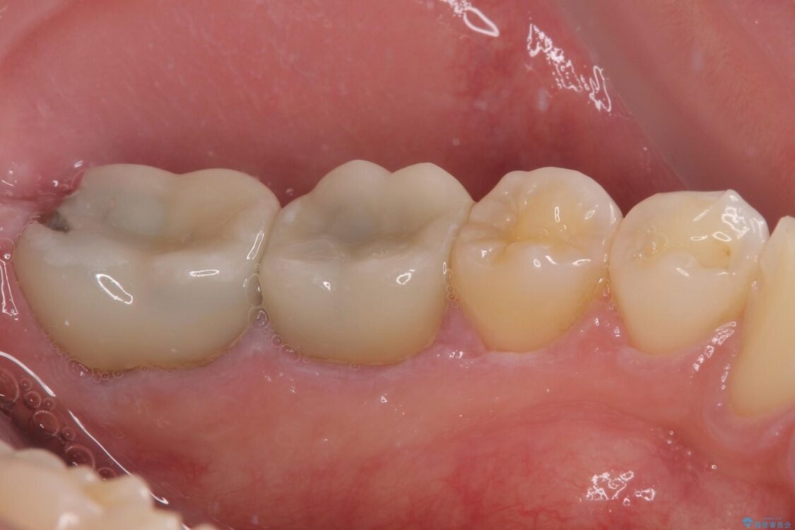 下顎の1番奥の歯であり、歯肉に覆われている部分が大きいためセラミックの十分な厚みが取れない状態でした。