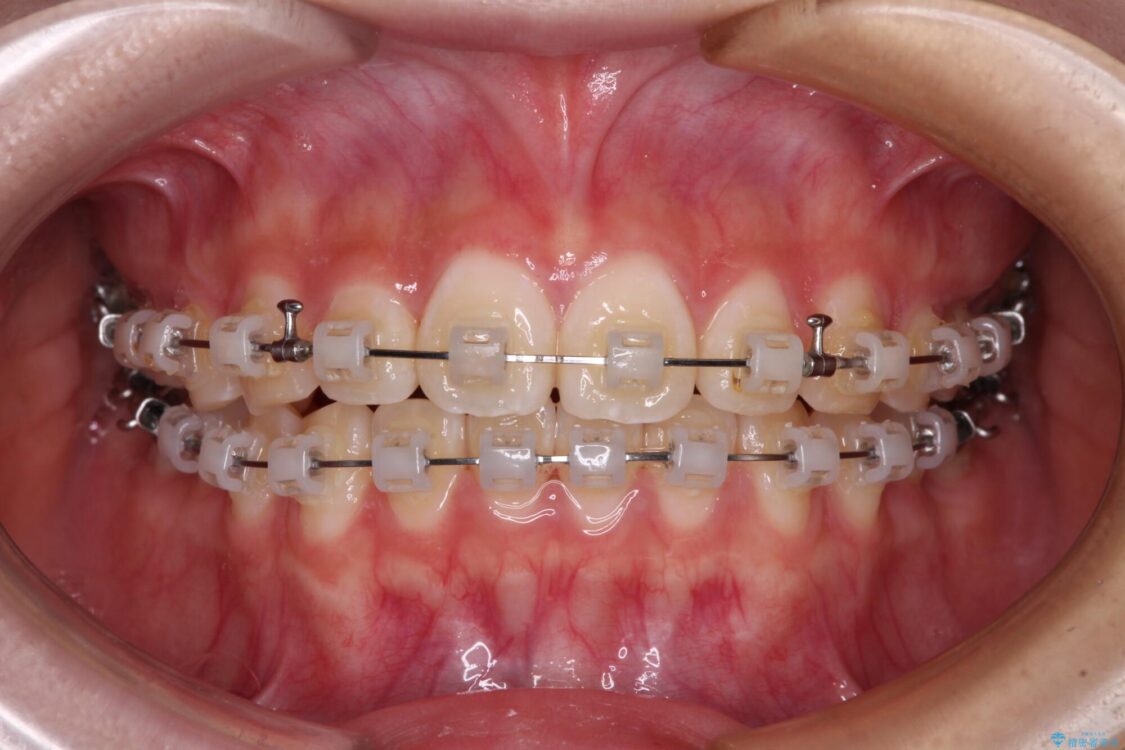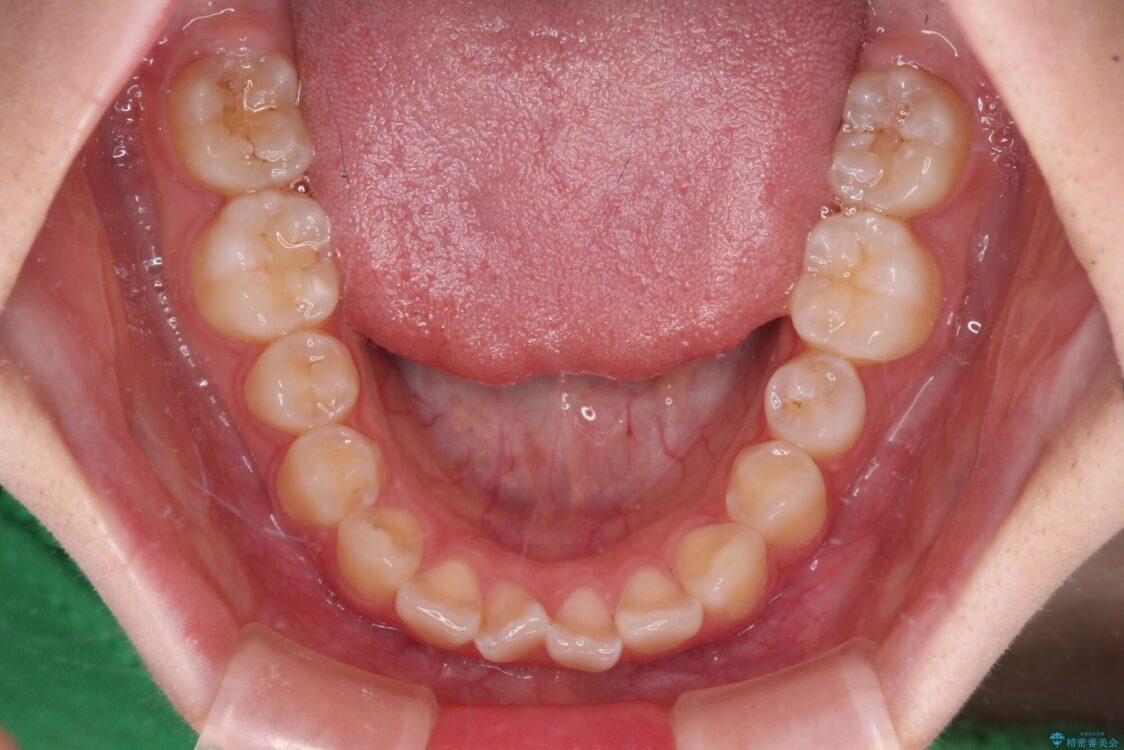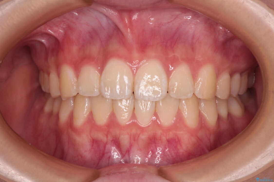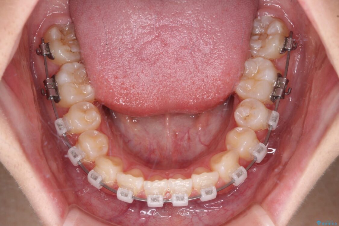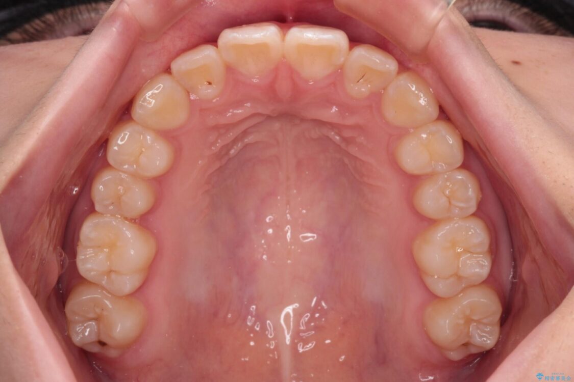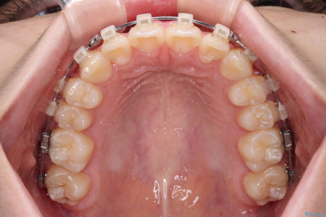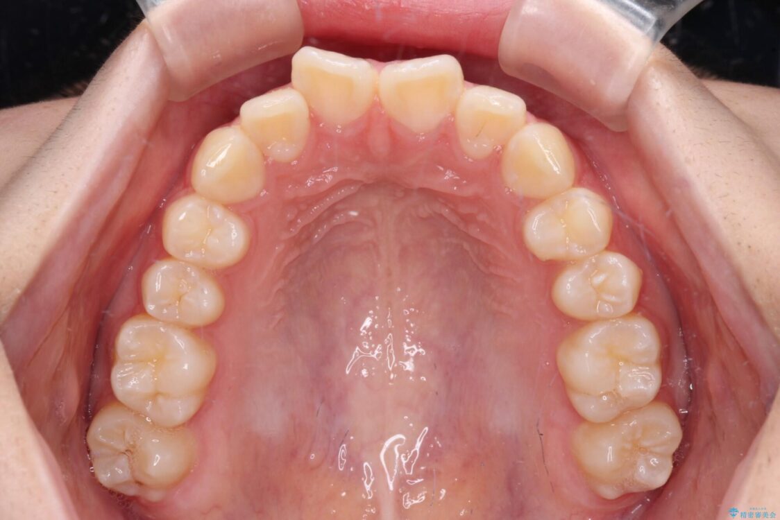 ワイヤー矯正でもマウスピース矯正でも対応可能でしたが、マウスピース矯正の自己管理が面倒であること、上顎前歯の捻転が著しいことから、ワイヤー矯正での治療を希望されました。