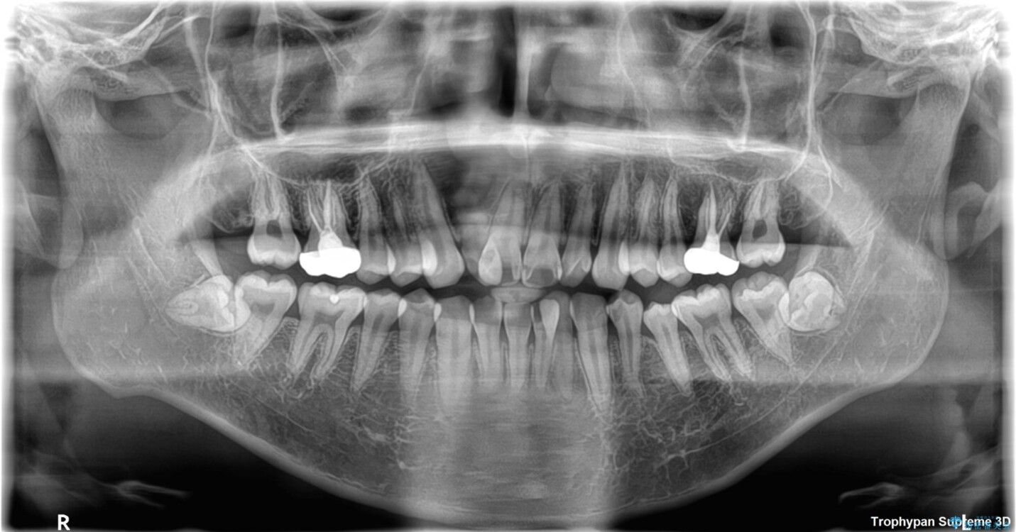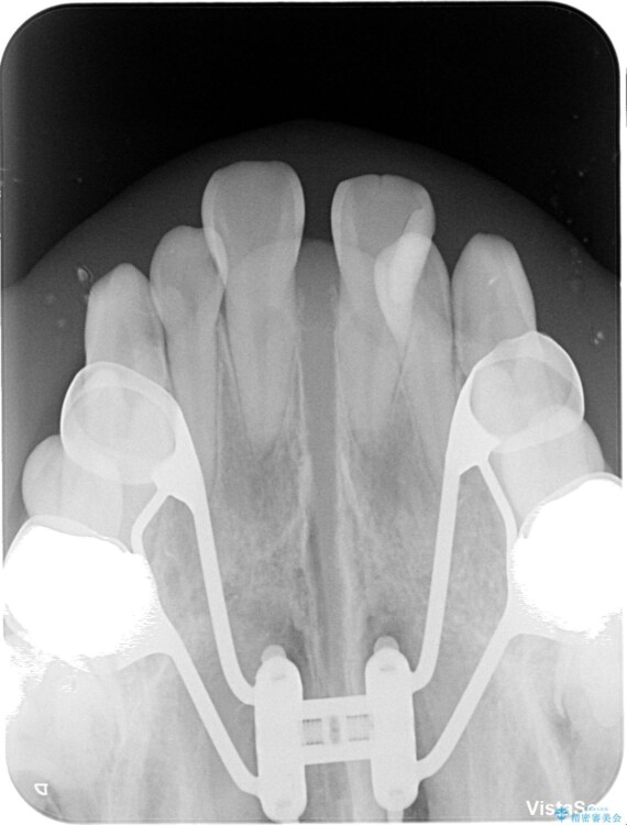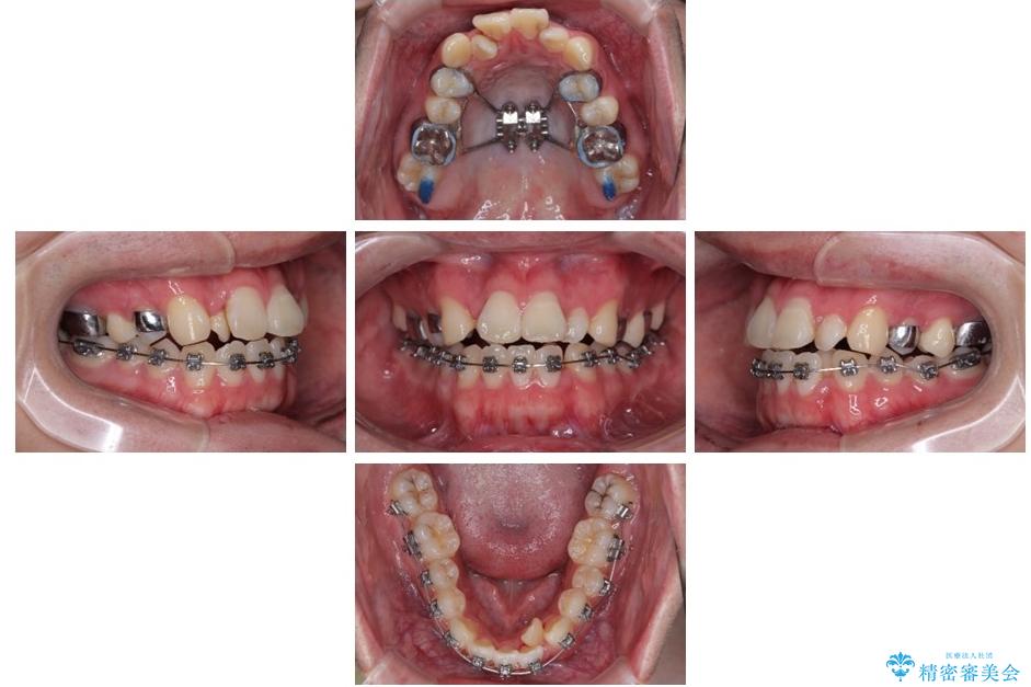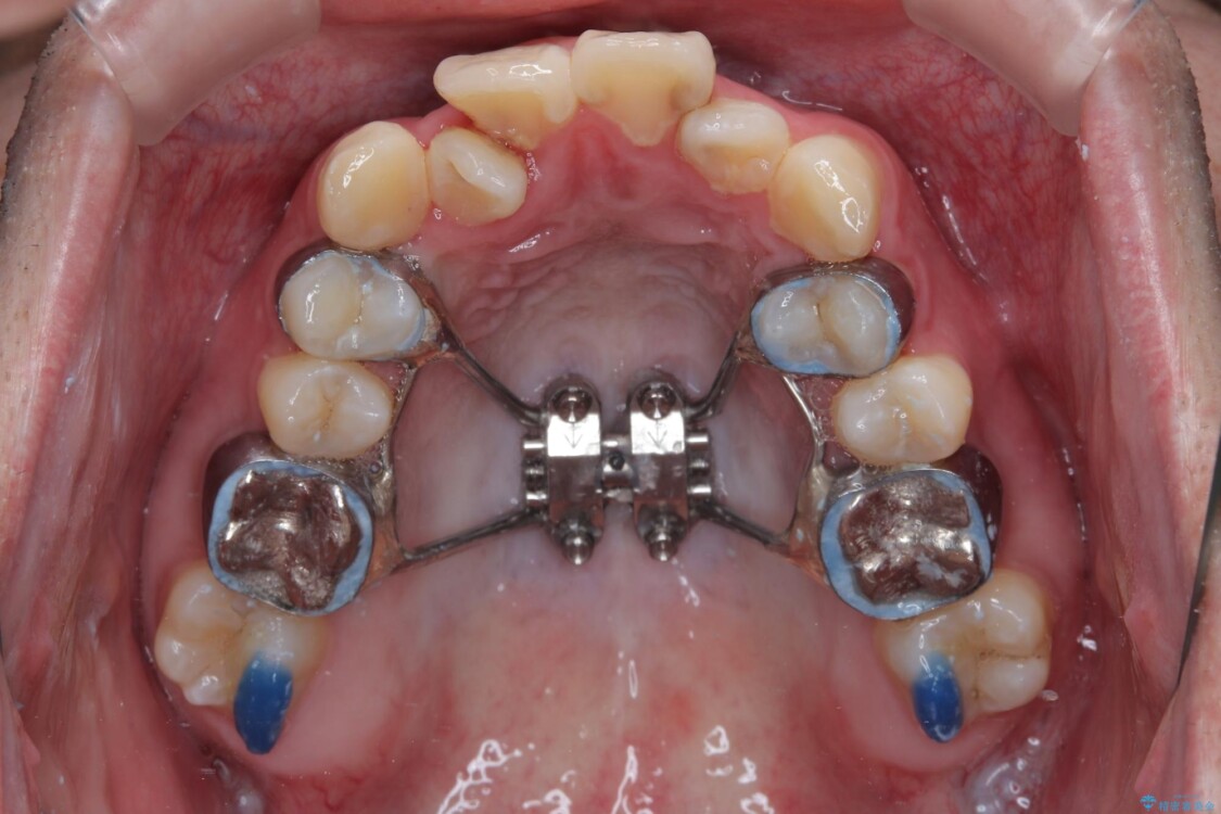 このような歯列の狭さに起因するデコボコを改善するために、**MARPE(骨に固定する上顎急速拡大装置)**を使用して、上顎の横幅を拡大し、これにより歯が並ぶためのスペースを確保し、メタルブラケットを用いて歯列を整えていく計画としました。