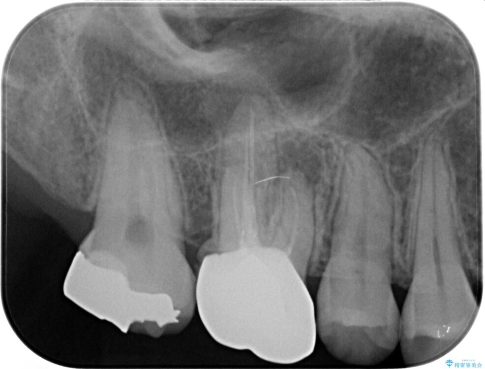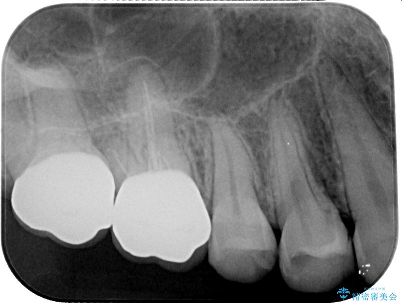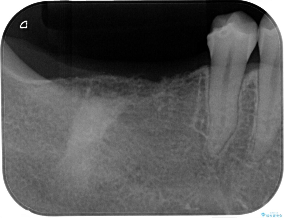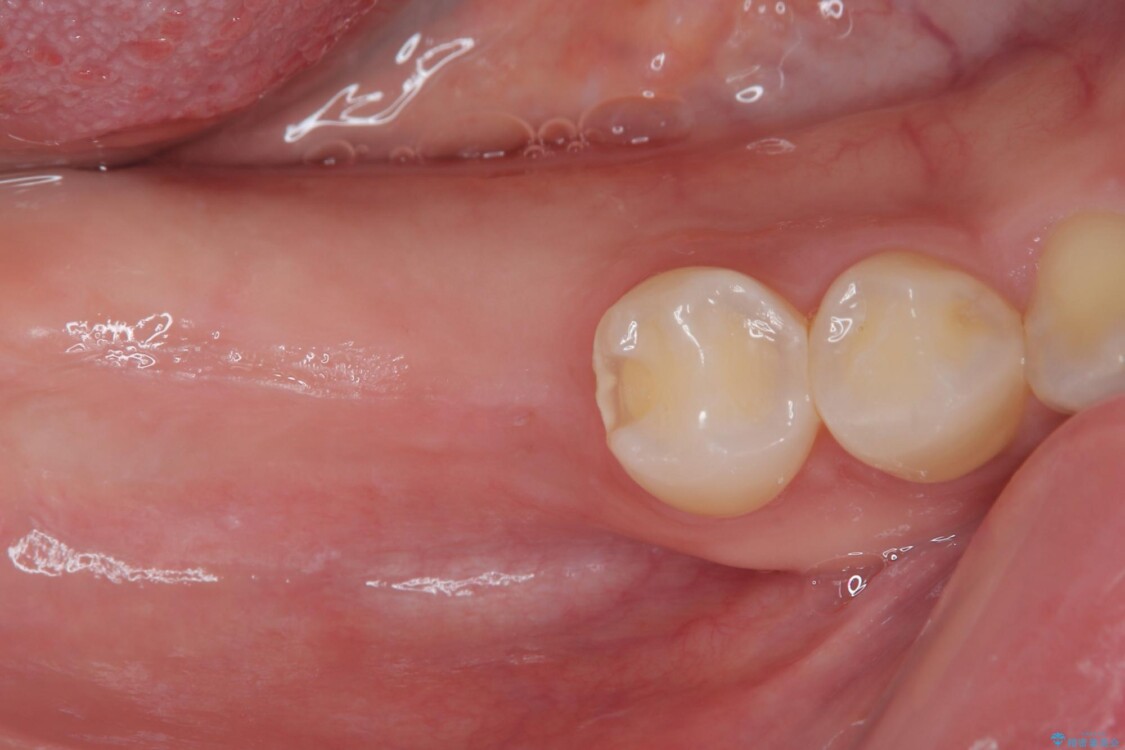 しかし、噛み合わせの相手である右上の第二大臼歯が、長期間噛み合う歯がなかった影響で**挺出(歯が下に伸びてくる状態)してしまっており、このままではインプラントを埋入して被せもの(上部構造)を入れるためのスペースが不足している状態でした。