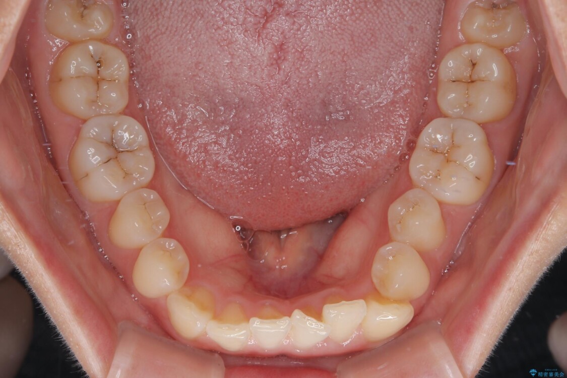 診察の結果、上下の前歯部に**叢生(そうせい/歯のガタガタ・重なり)**が認められました。