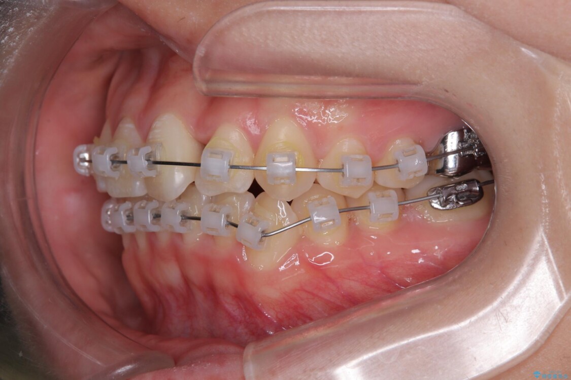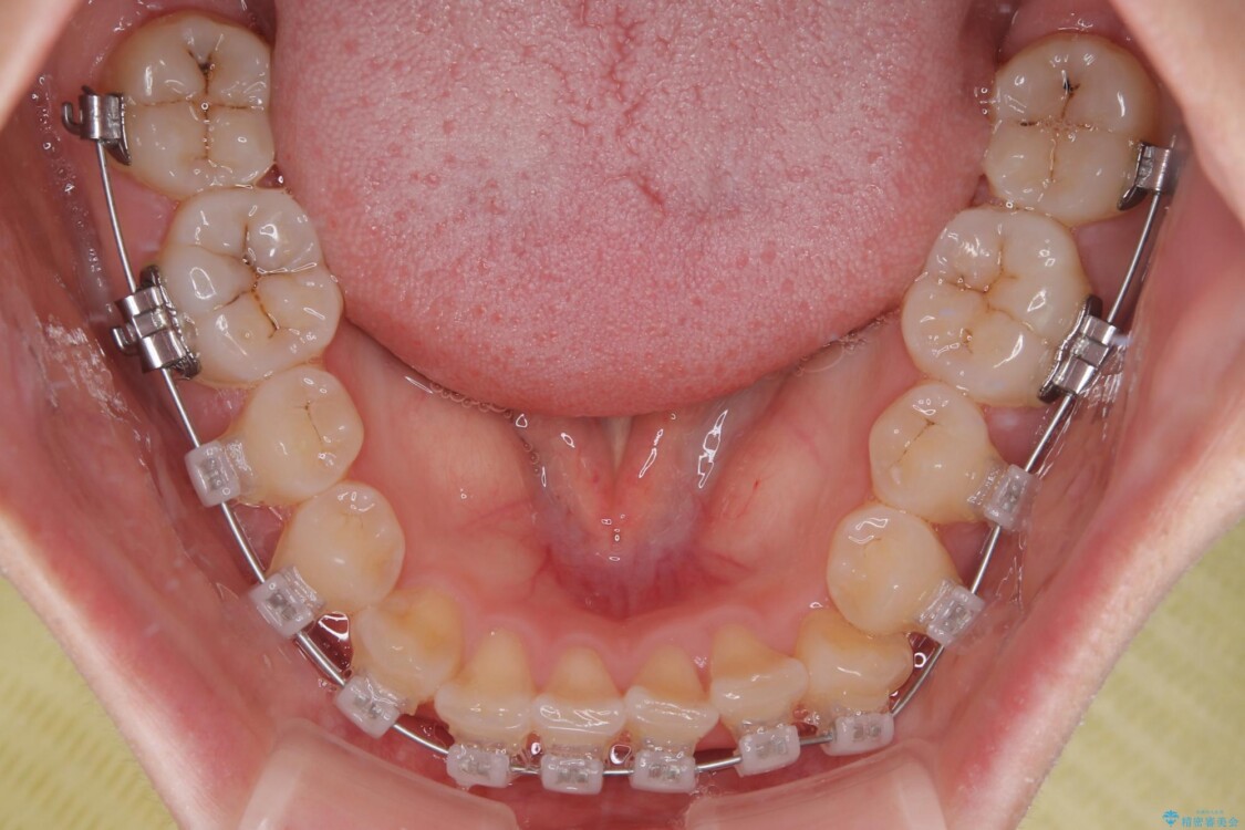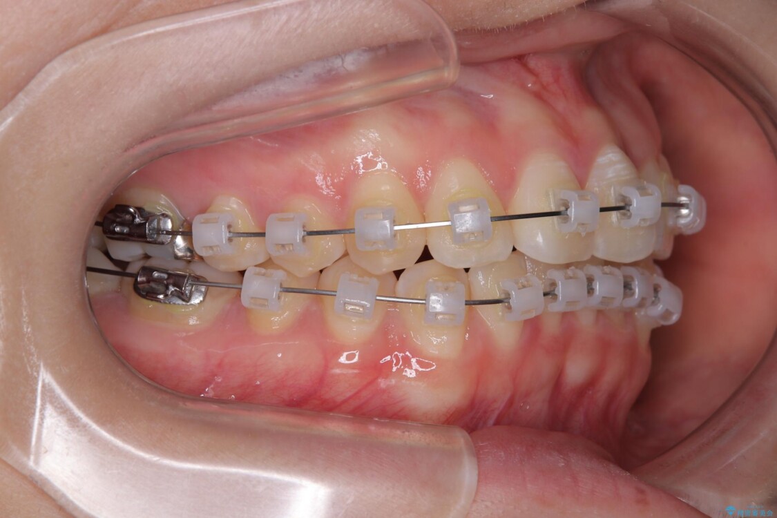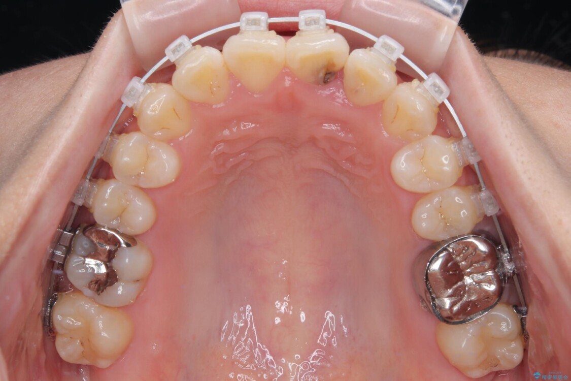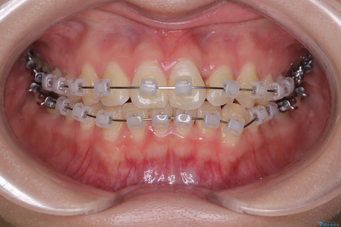 治療方法としては、装置の目立ちにくさと費用面のバランスを考慮して、プラスチック製のクリアブラケットとメタルワイヤーを組み合わせた矯正装置を使用することにしました。